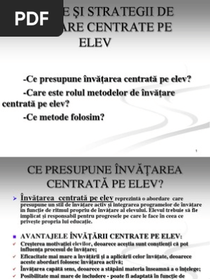 vizitati articolul complet aici : https://ro.pinterest.com/pin/206884176611156097/ Textul integral poate fi gasit in documentele atasate: Metodele centrate pe elev implic individul n evaluarea eficacitii procesului lor de nvare i n stabilirea obiectivelor pentru dezvoltarea viitoare. Centrate pe predare, pe transmiterea de cunoştinńe;
